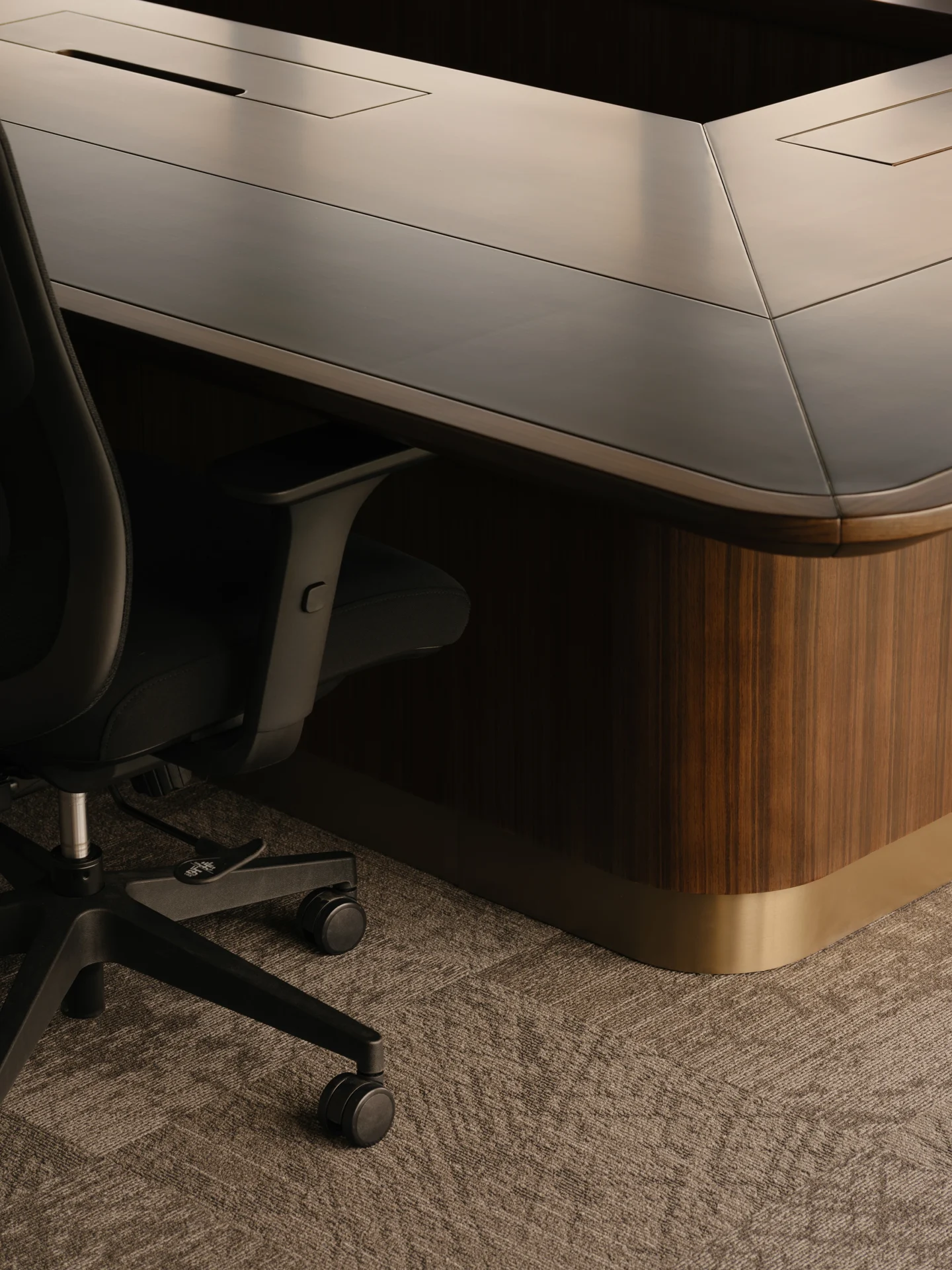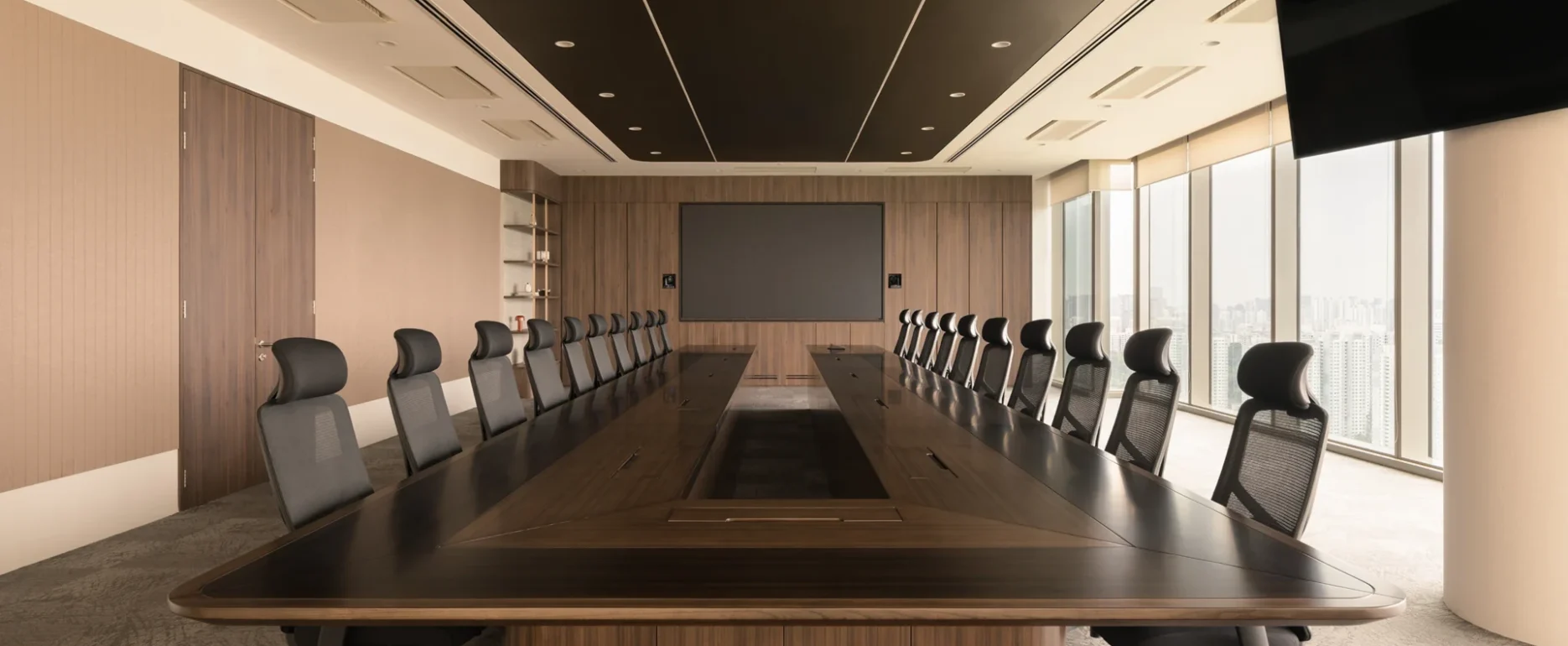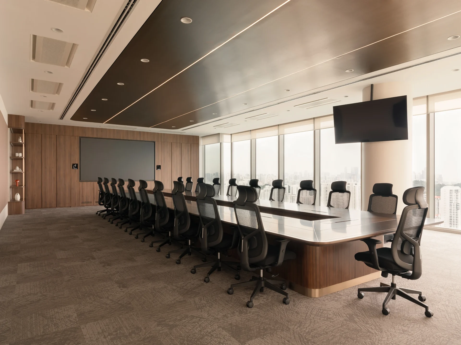 At the heart of the project is a bespoke U-shaped boardroom table—an artisanal centrepiece crafted by Ngee Koon’s team of skilled carpenters and millworkers. With precision joinery and subtle gold metallic detailing, this custom-built piece reflects both technical excellence and refined craftsmanship, elevating the executive space with a timeless presence.