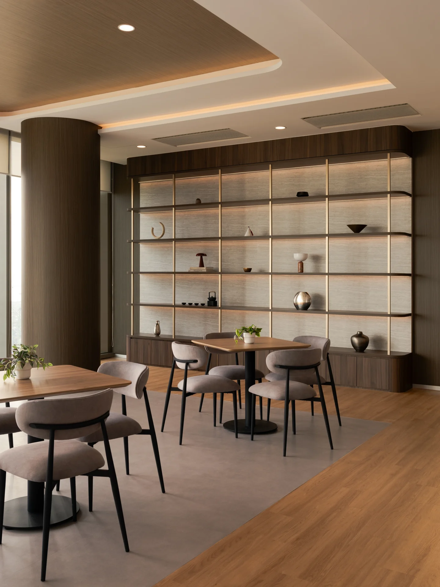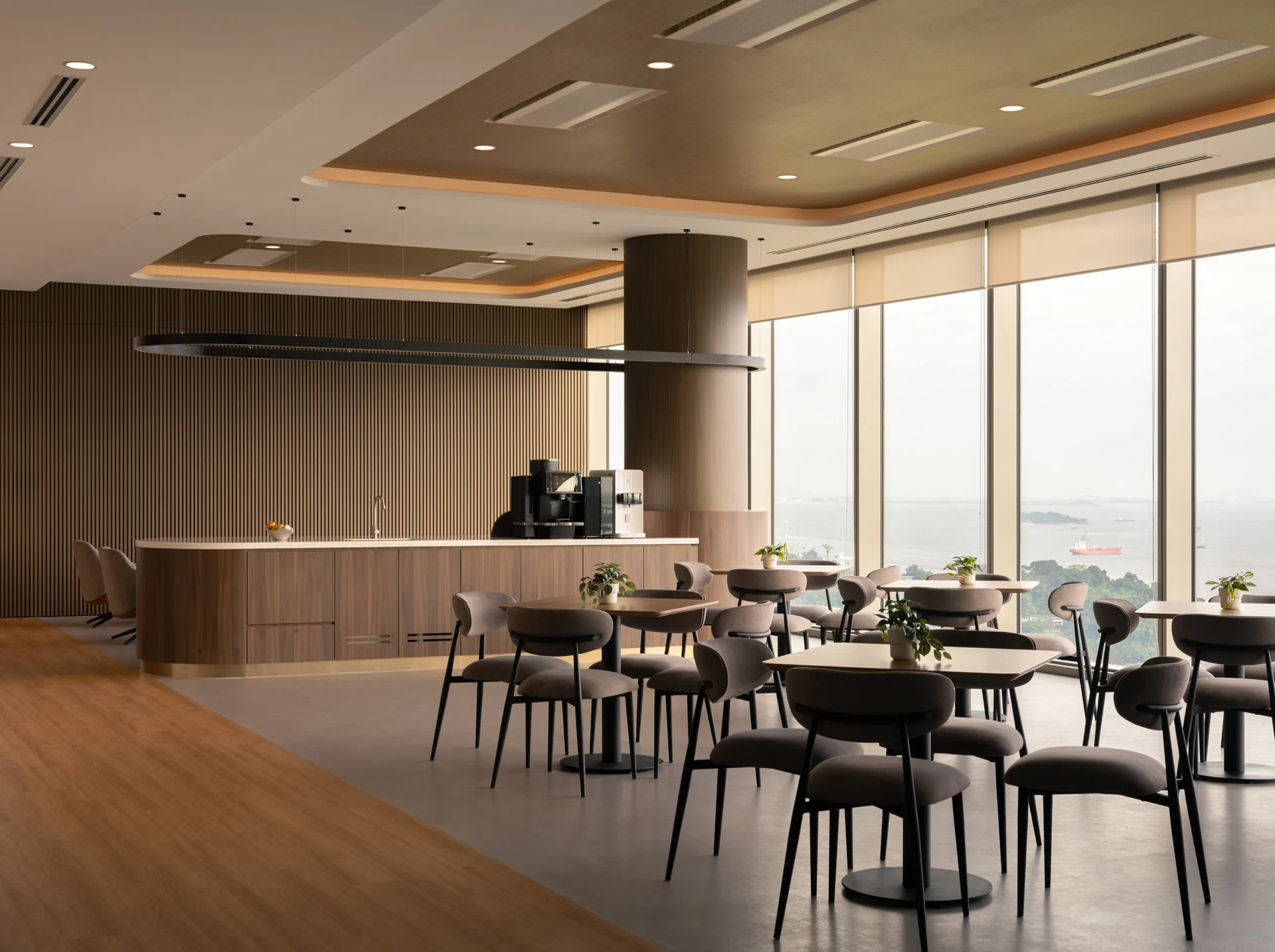 From the vibrant work café at the centre of the office—designed to harness natural light and panoramic waterfront views—to the integration of metallic accents, warm wood tones, and acoustic solutions, our team ensured that every detail of the design was faithfully realised.