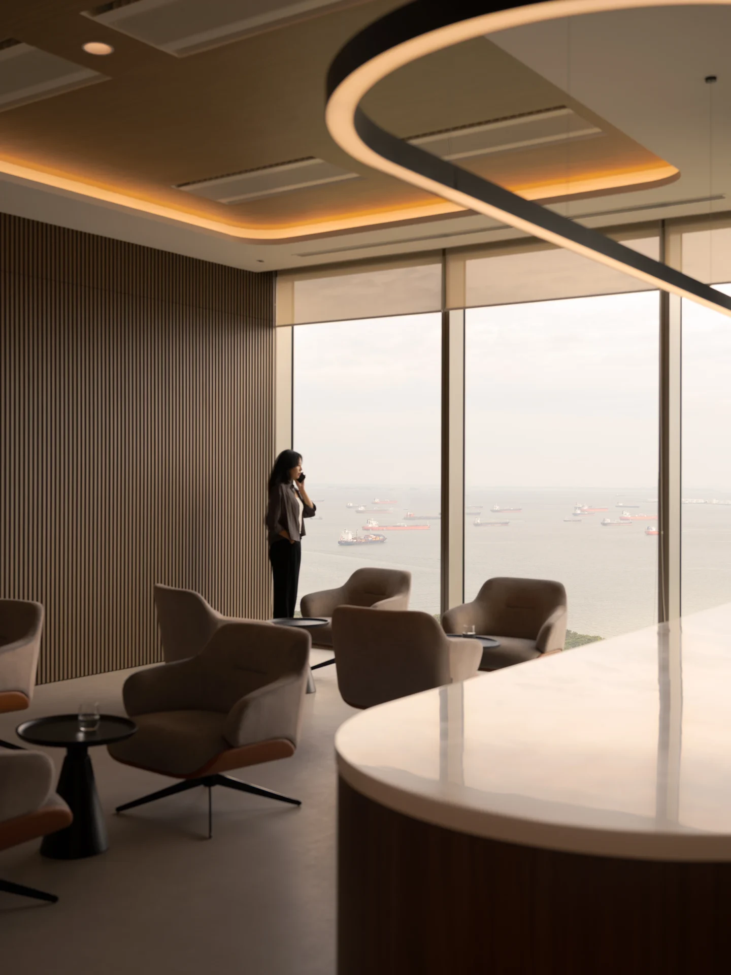 Beyond the feature furniture, Ngee Koon’s role extended across the entire fit-out, executing high-quality finishes, custom carpentry, and meticulous detailing. From the vibrant work café at the centre of the office—designed to harness natural light and panoramic waterfront views—to the integration of metallic accents, warm wood tones, and acoustic solutions, our team ensured that every detail of the design was faithfully realised.